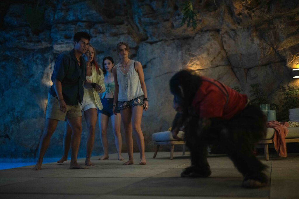 Visually, Primate contrasts sun-drenched luxury with encroaching menace. Shot on meticulously crafted sets, the film uses space, silence and confinement to build tension, turning open-plan architecture and pristine swimming pools into sites of sustained terror. The sound design and score further heighten the unease, amplifying the sense that danger is never out of reach.