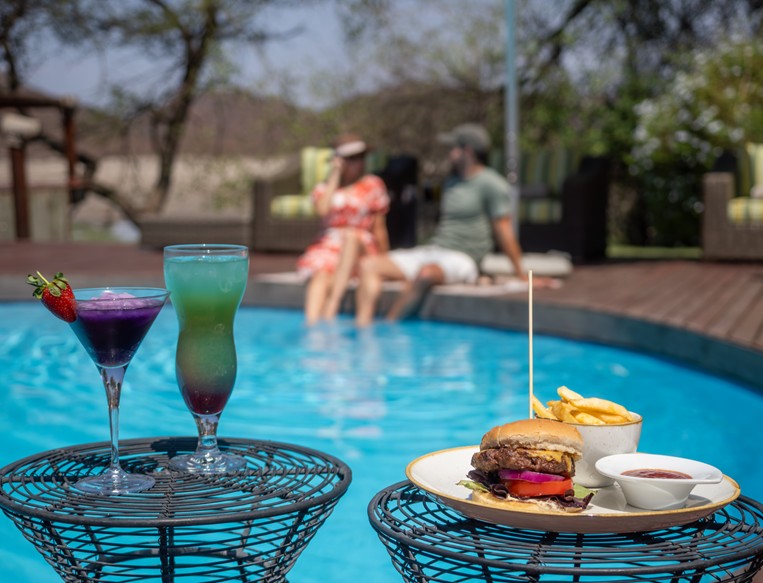 Both pools, one at the main hospitality deck, the other an infinity pool with a tented bar known for its delicious cocktails, overlook the magnificent waterhole.