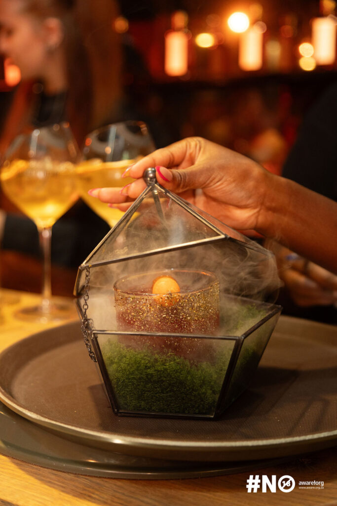The House of Amber cocktail experience, curated by the Just Short mixology team, brings Inverroche’s alchemy to life. Signature serves like Where There’s Smoke, a dramatic terrarium-style creation, and Letters to Lorna, an ode to Inverroche founder Lorna Scott, turn every sip into a story.