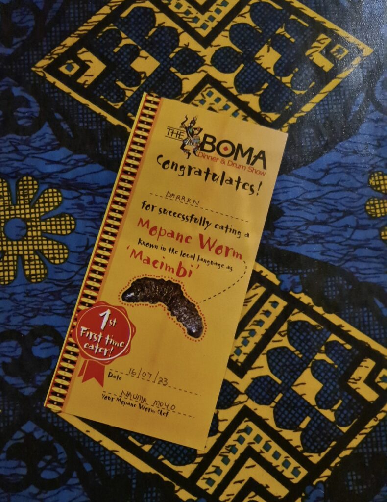 ​The feast is generous and experiential, a celebration of regional tastes. And yes… somewhere between curiosity and courage, I had my first taste of a Mopane worm. It’s a texture and a moment marked not just by the earthy flavour, but by the certificate of bravery I proudly walked away with which is a playful reminder that travel should always involve a bit of the unexpected.